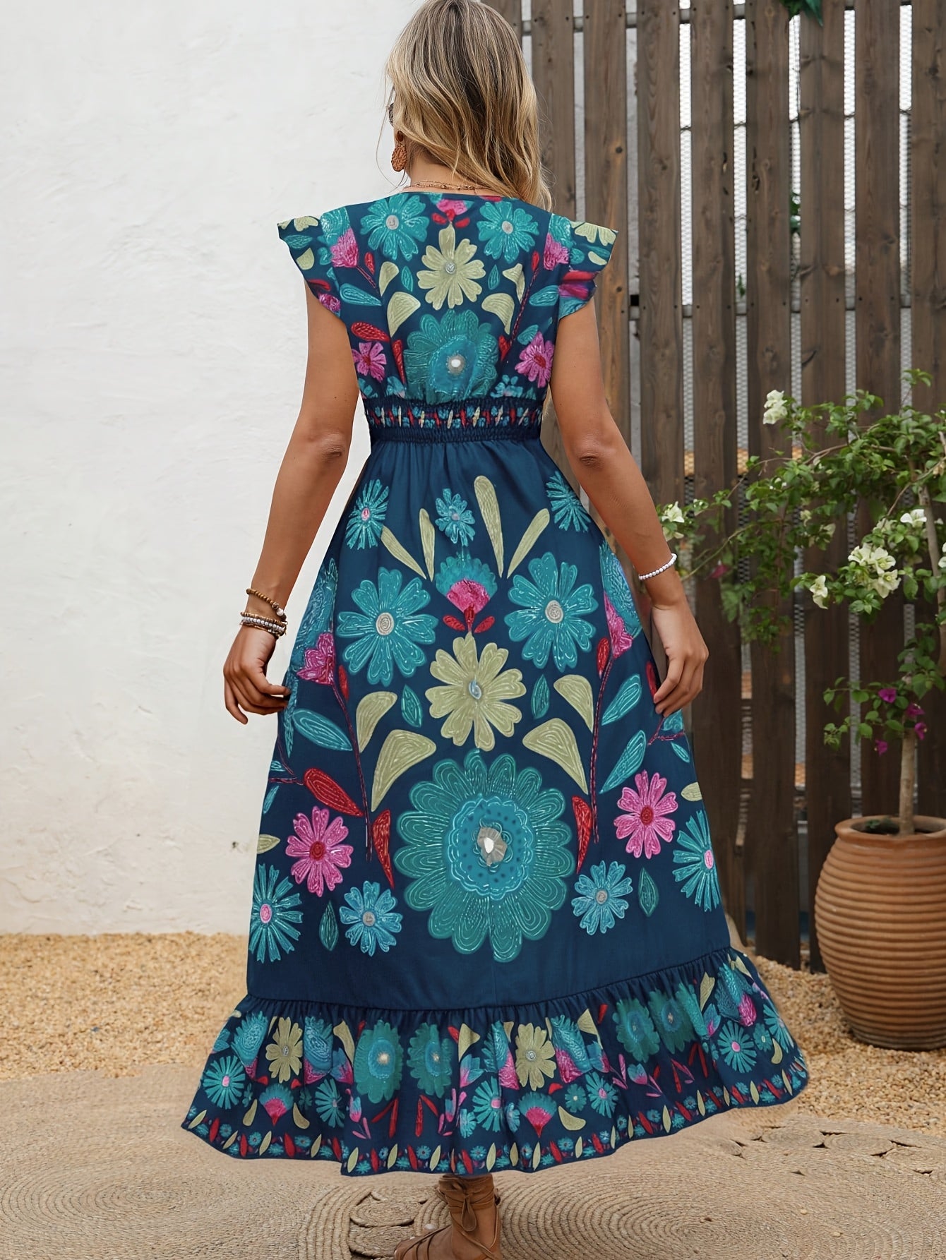 Élodie – Robe longue bohème à col en V, taille ceinturée, ourlet à volants